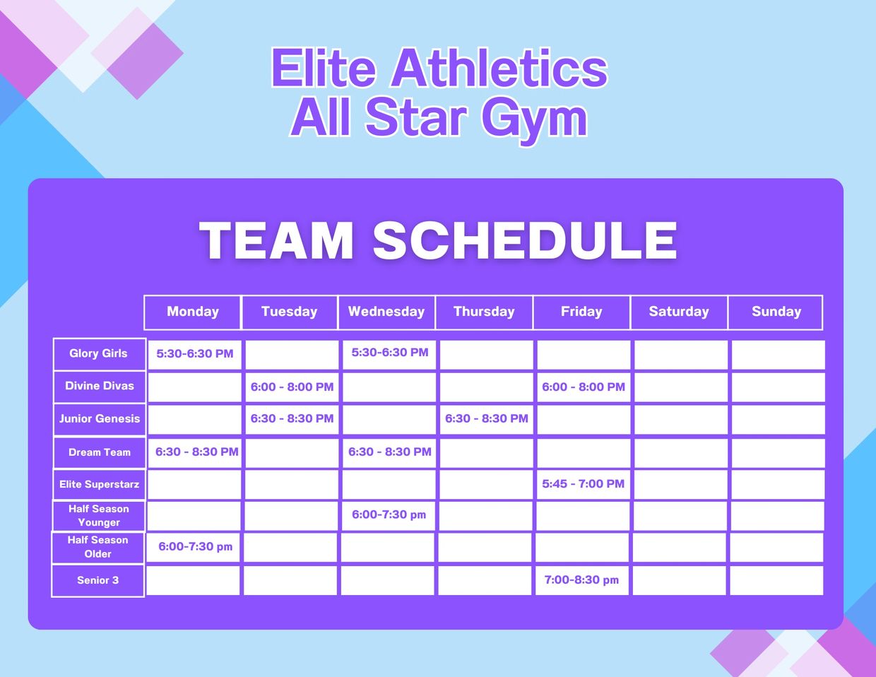 Elite Athletics Gym Team schedule